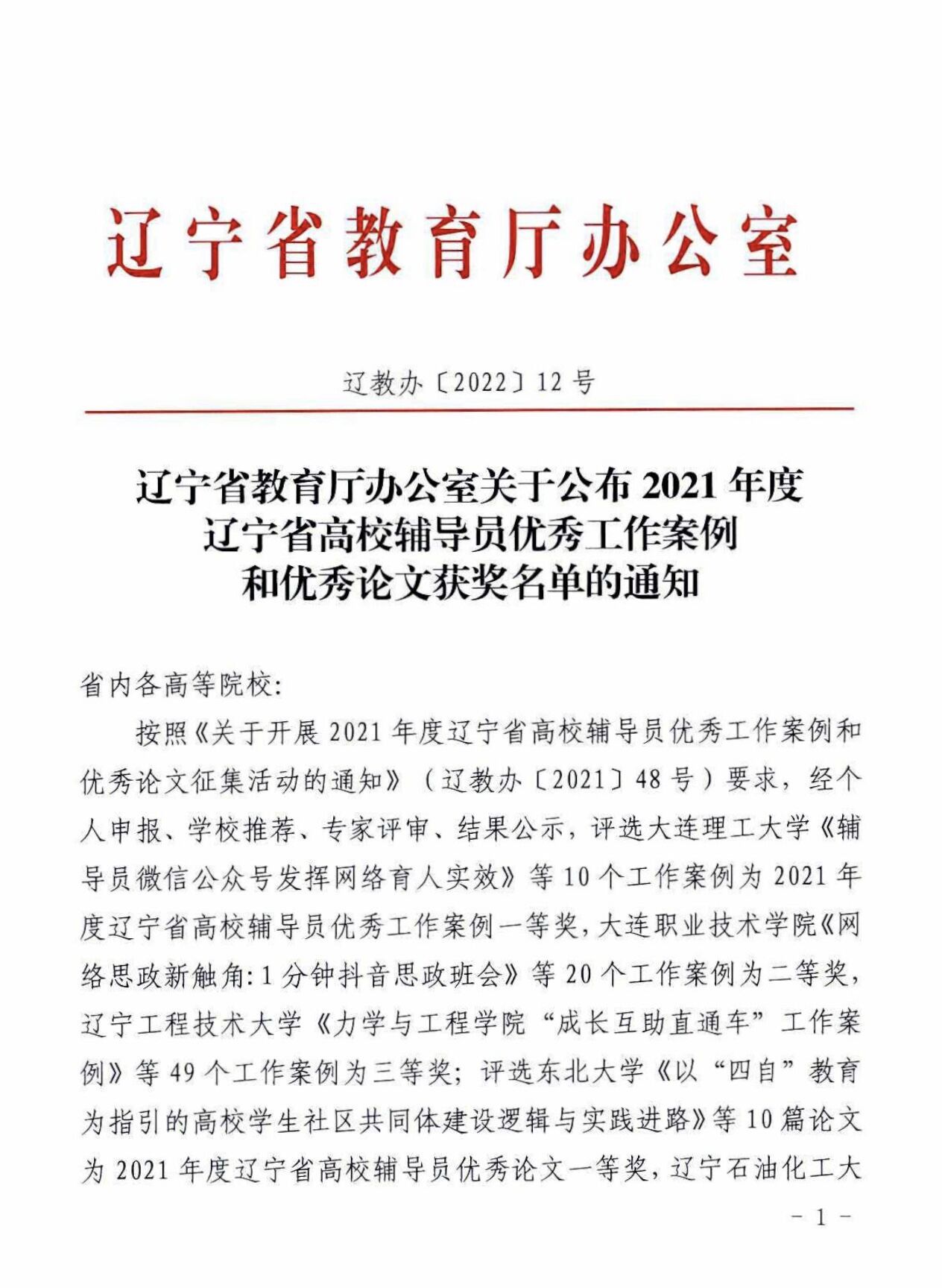 近日,辽宁省教育厅公布了2021年度辽宁省高校辅导员优秀工作案例和优秀论文评选结果,经个人申报、学校推荐、专家评审、结果公示等环节,最终我校贾云飞、何大伟老师撰写的工作案例《云说工作室》荣获三等奖。并于1月24日参加了辽宁省高校辅导员科研素质能力提升工作线上活动。
