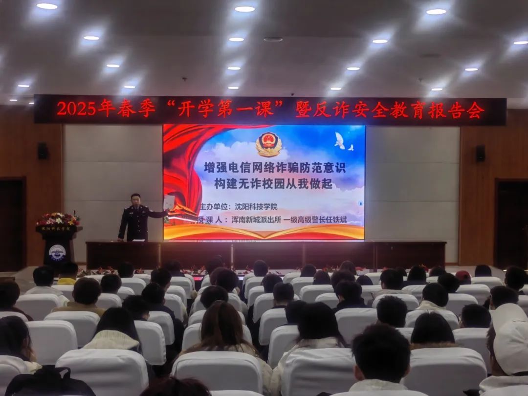 提高警惕、反诈于行。3月5日,学校2025年春季开学第一课暨反诈安全教育报告会在图书馆报告厅如期开讲,本次活动特邀请浑南新城派出所任铁斌警官来校进行反诈宣讲。任铁斌通过专业视角和多年来丰富的工作经验,为同学们深入剖析了当前网络诈骗的严峻形势,从而提升学生的反诈意识,保护学生财产安全,营造安全和谐的校园环境。